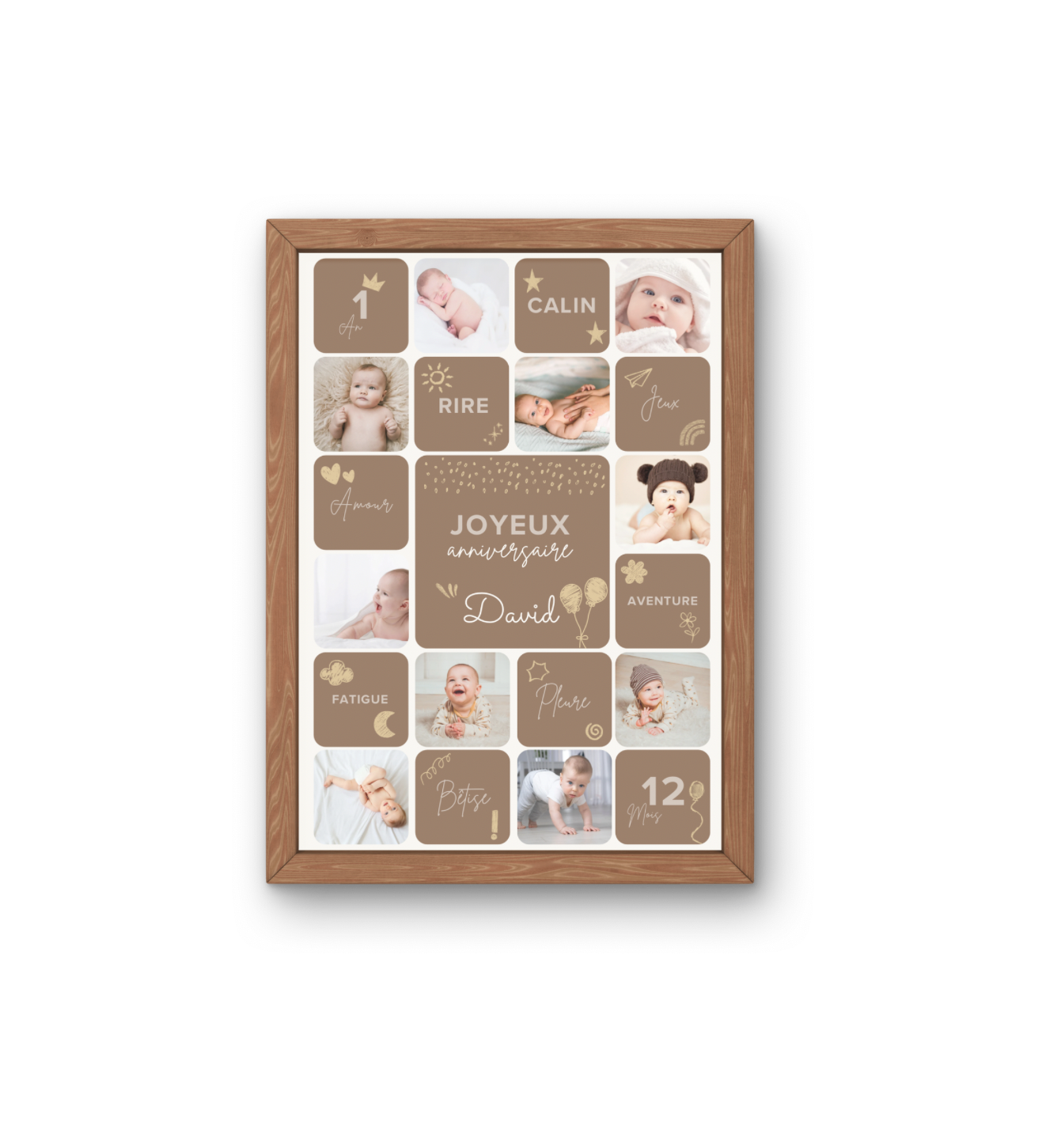 Ce collage visuel retrace ses plus beaux moments : sourires, découvertes, aventures, câlins… tout ce qui rend sa première année si précieuse.