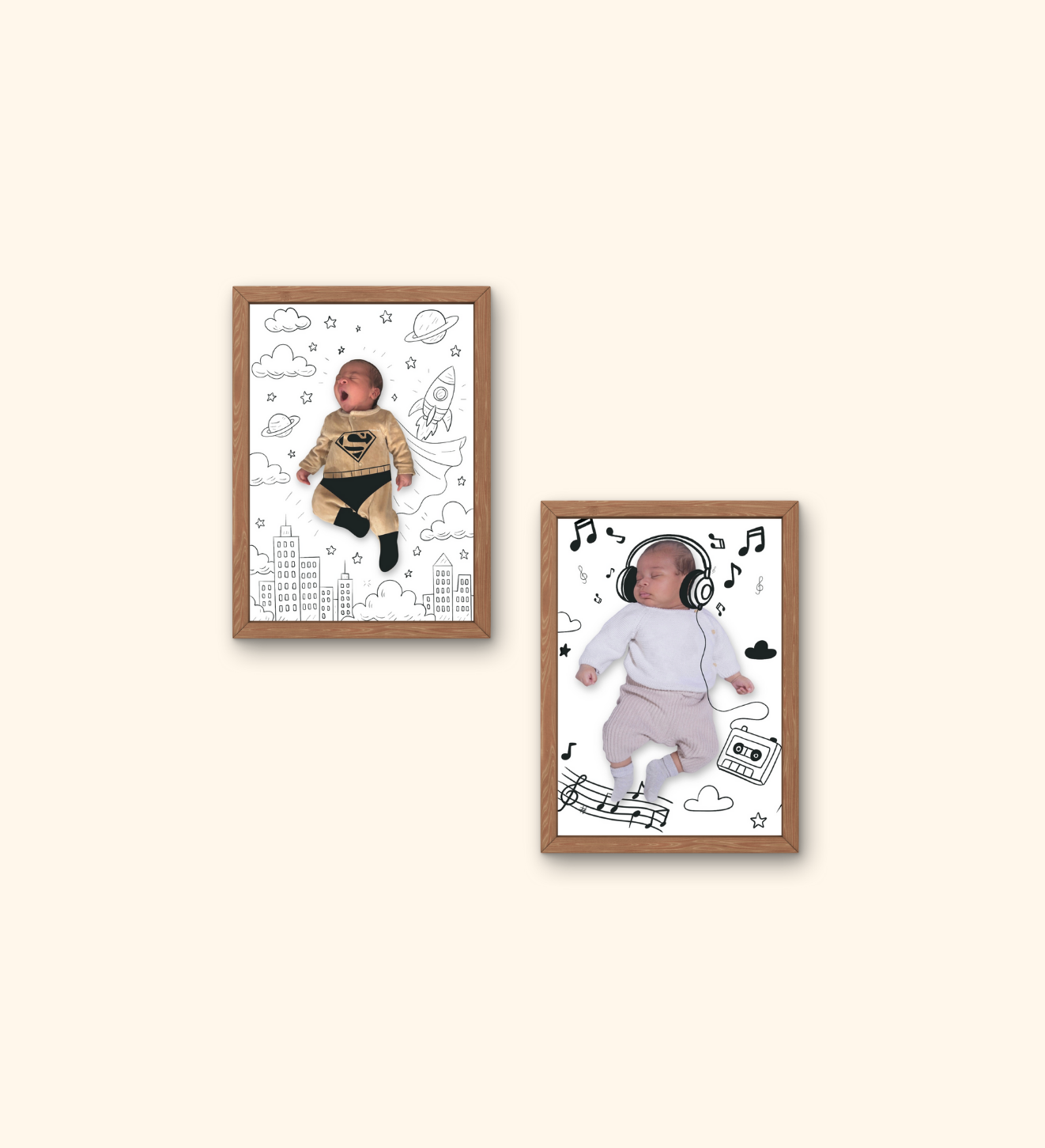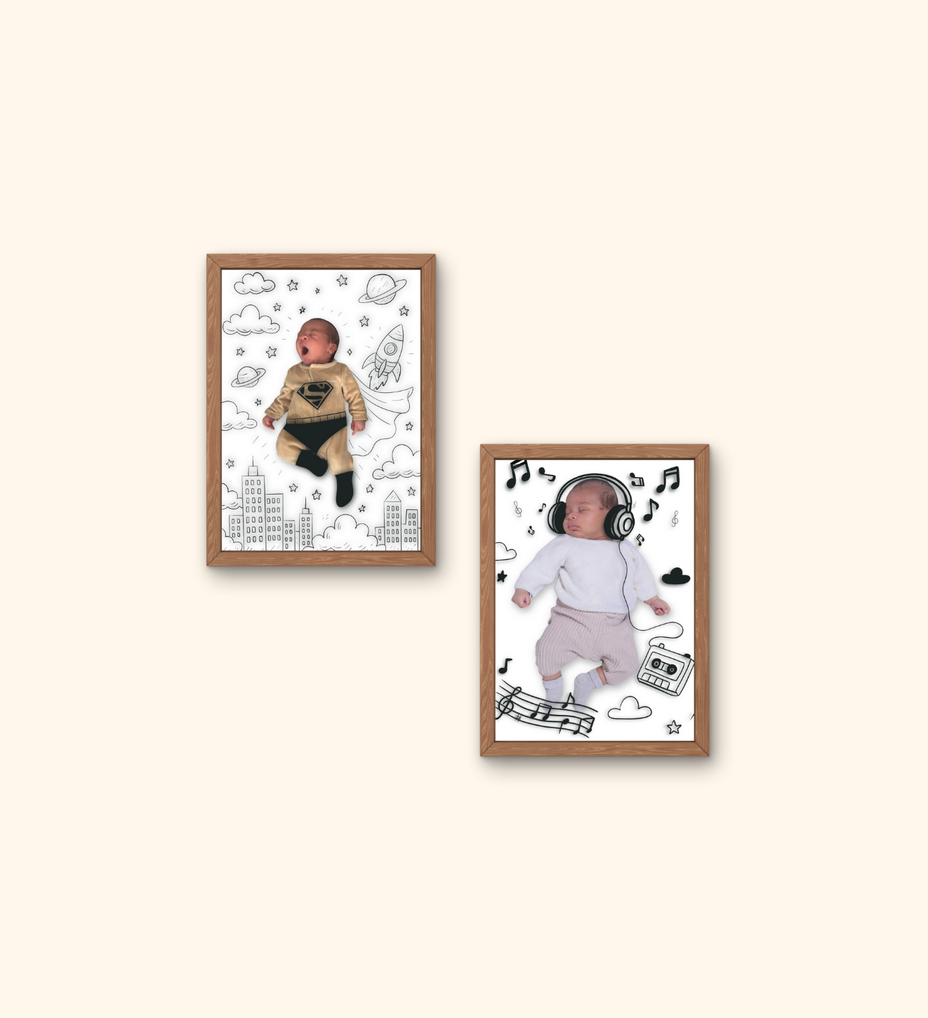 Avec ce dessin ajouté directement sur la photo de votre bébé, j’imagine une scène tendre, poétique ou amusante : astronaute, petit musicien, fée, aventurier, super-héros, ou tout autre univers qui vous ressemble.