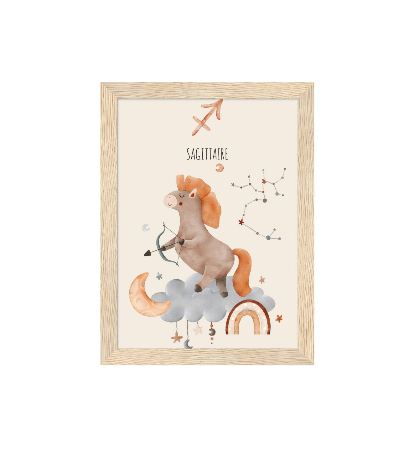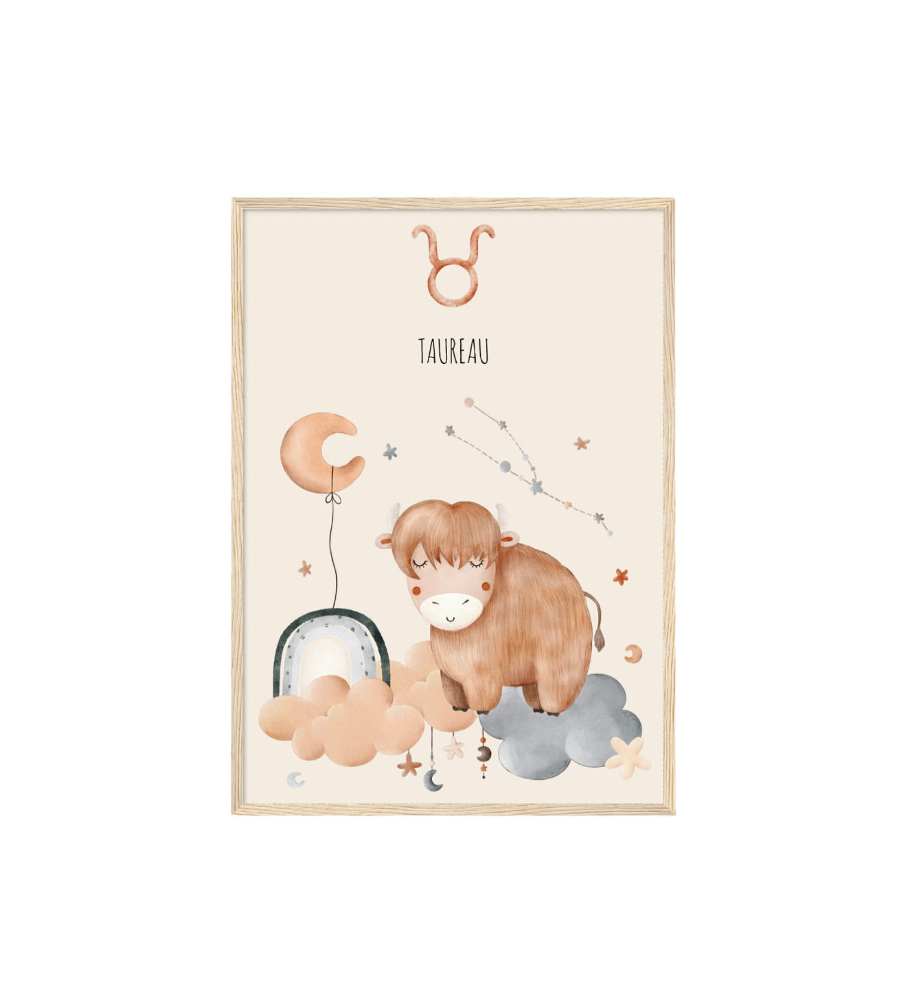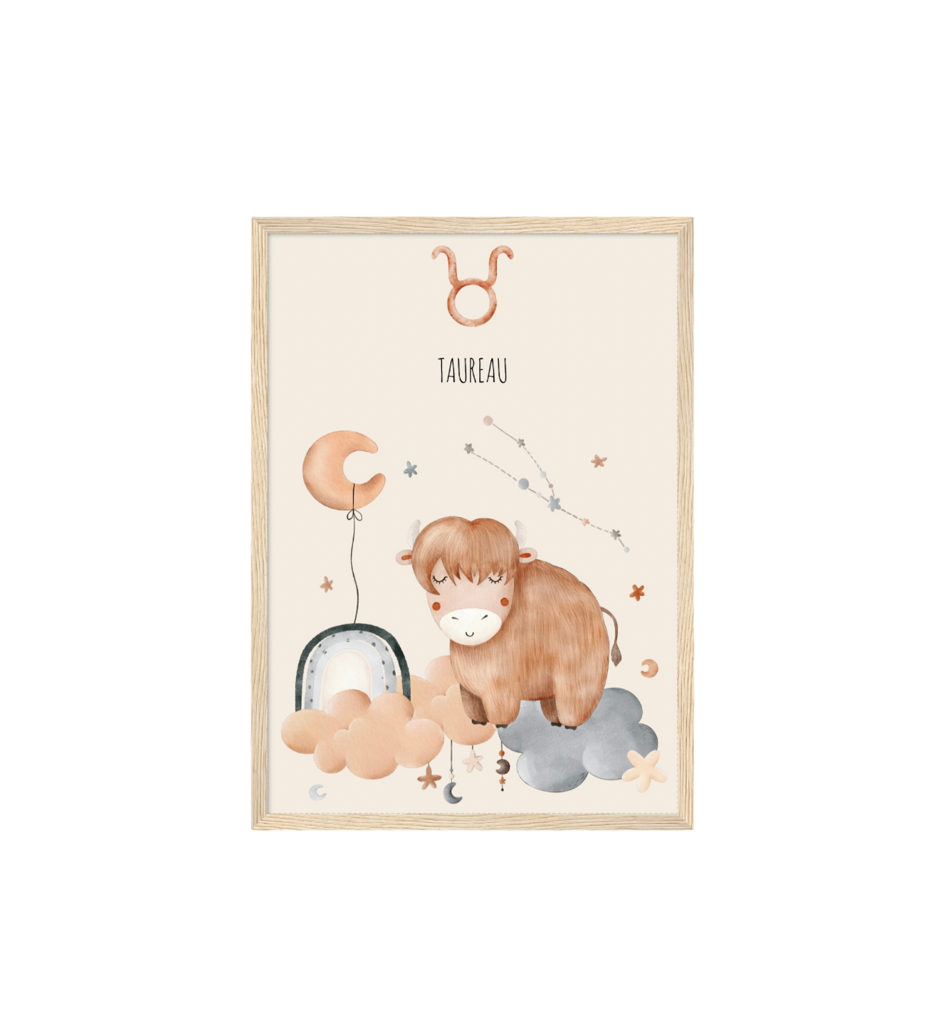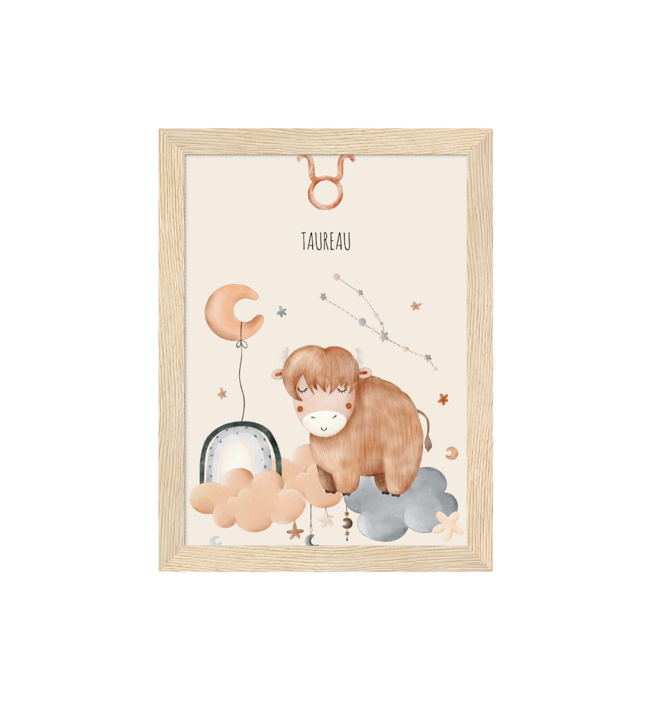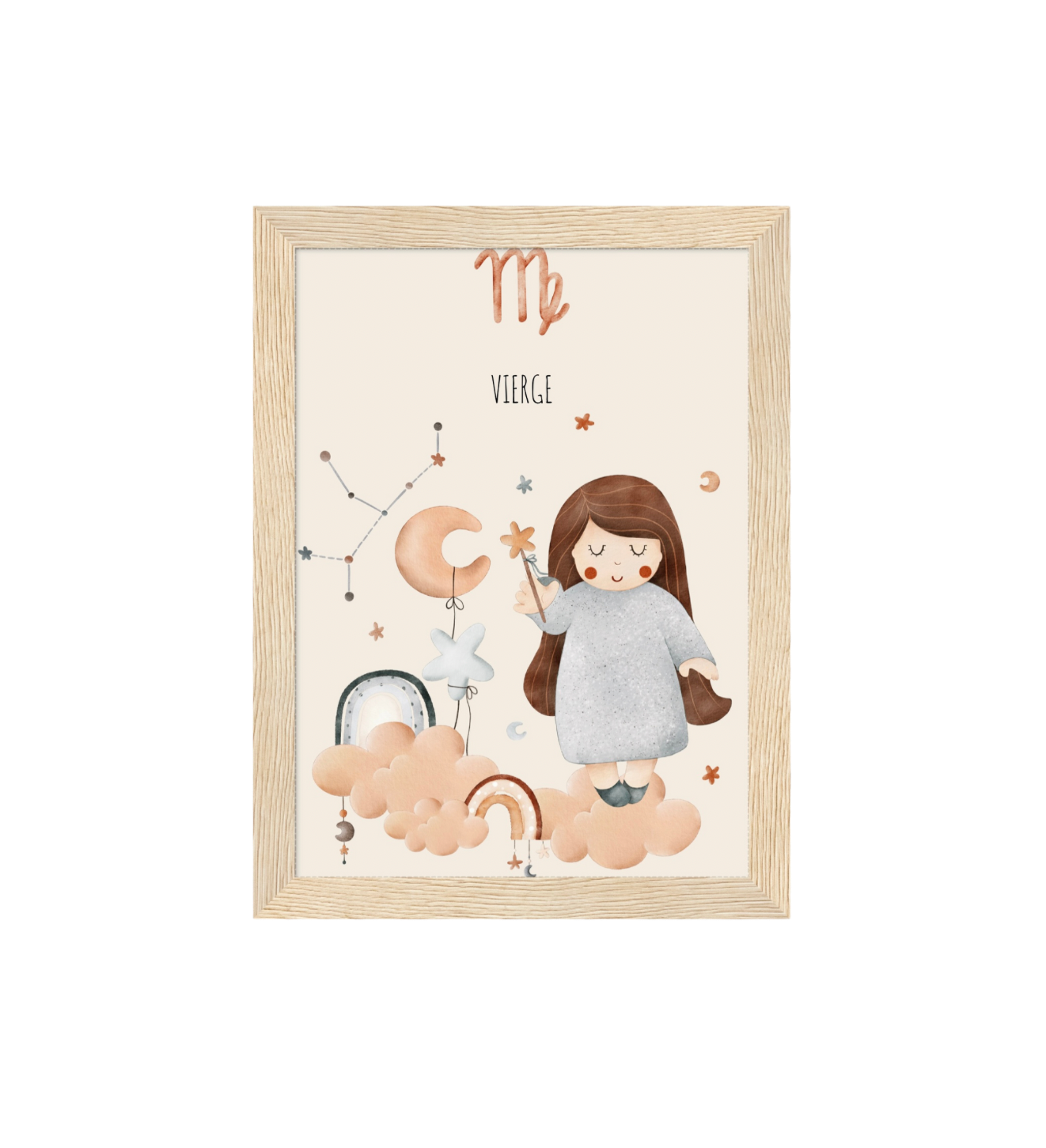 Ce cadre en bois met en valeur une illustration en aquarelle inspirée de son signe astrologique, pour un décor doux, poétique et intemporel.