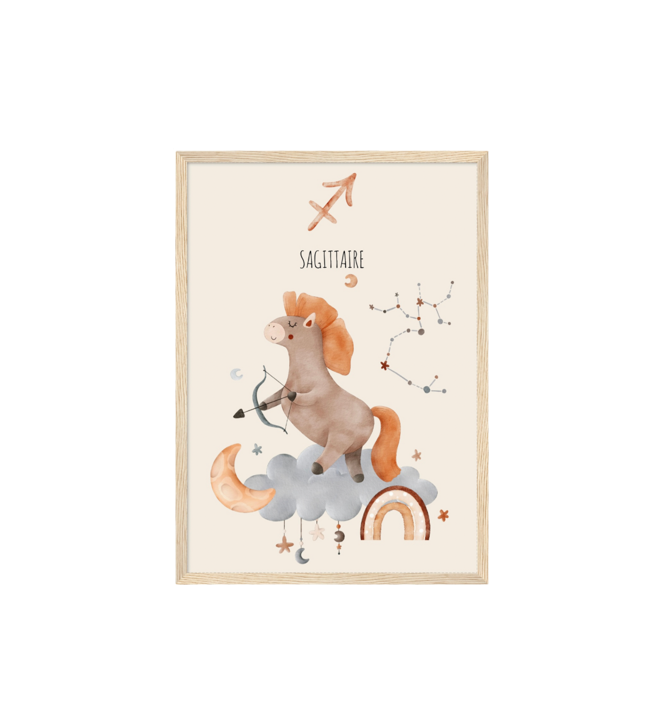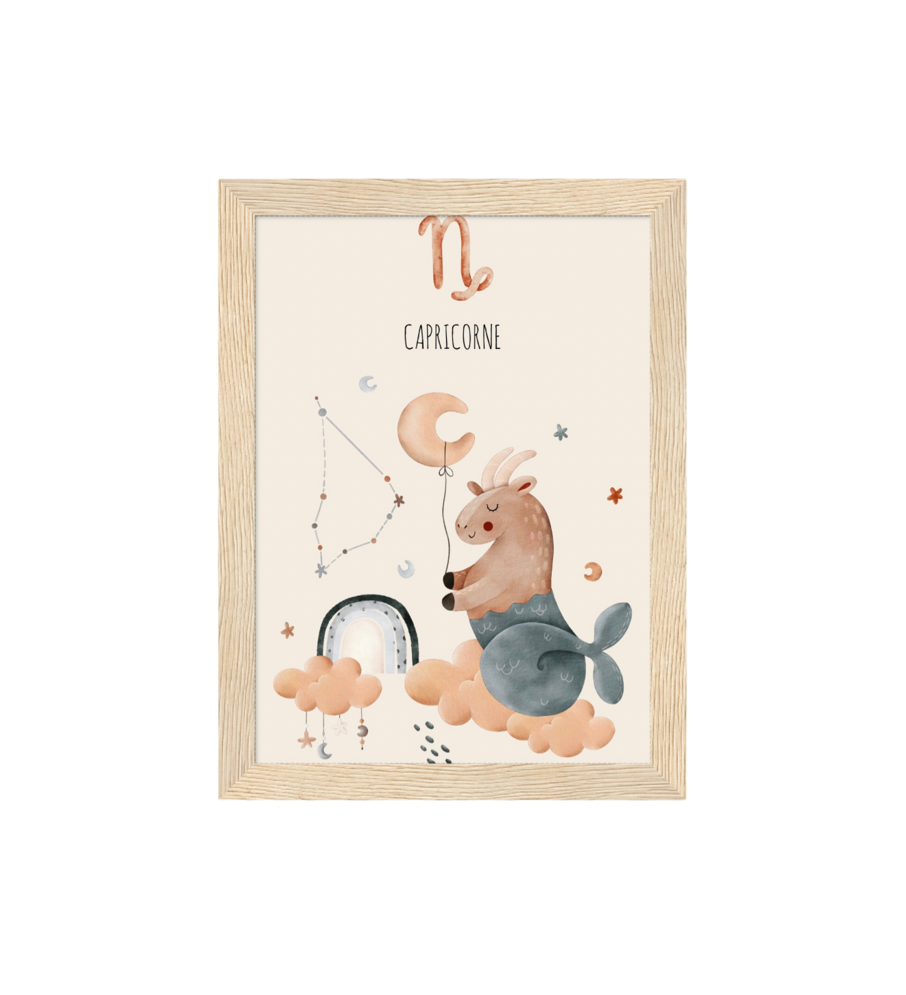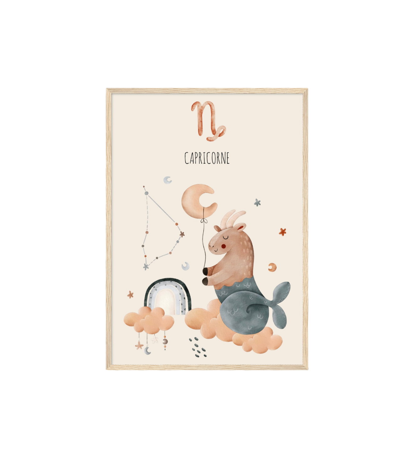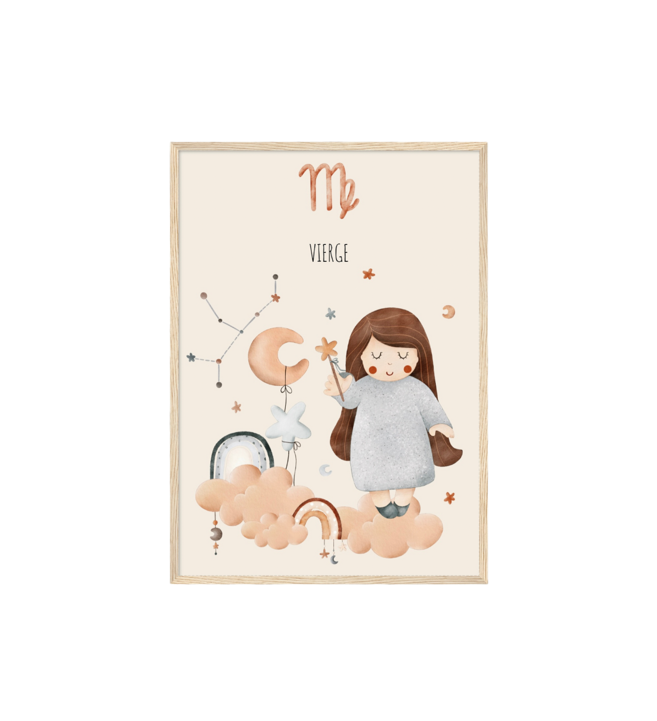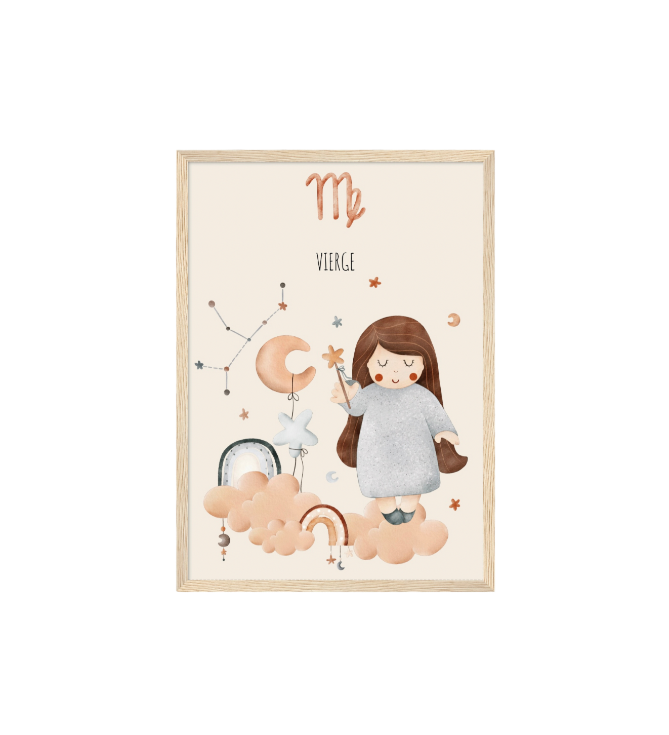 Ce cadre en bois met en valeur une illustration en aquarelle inspirée de son signe astrologique, pour un décor doux, poétique et intemporel.