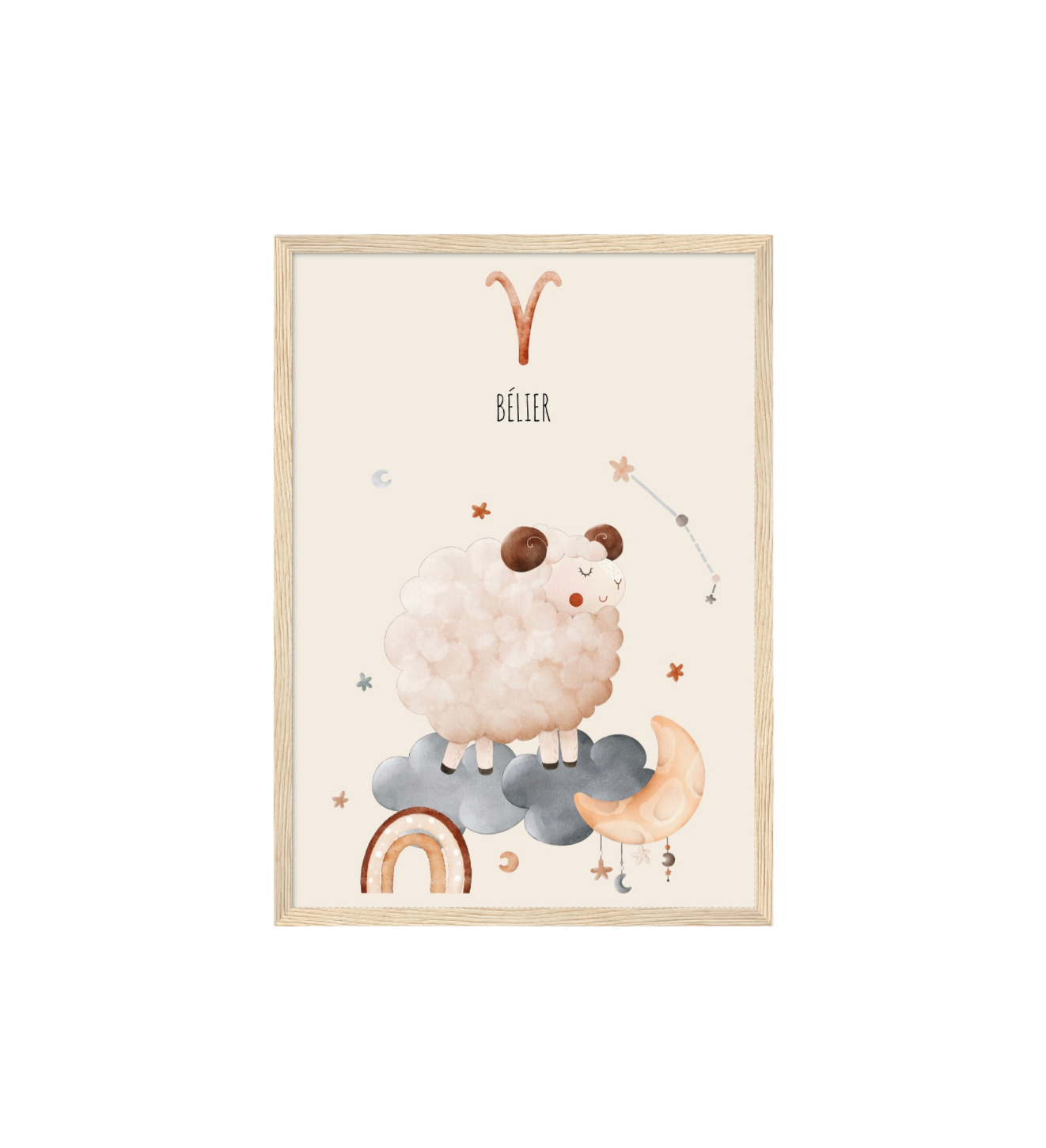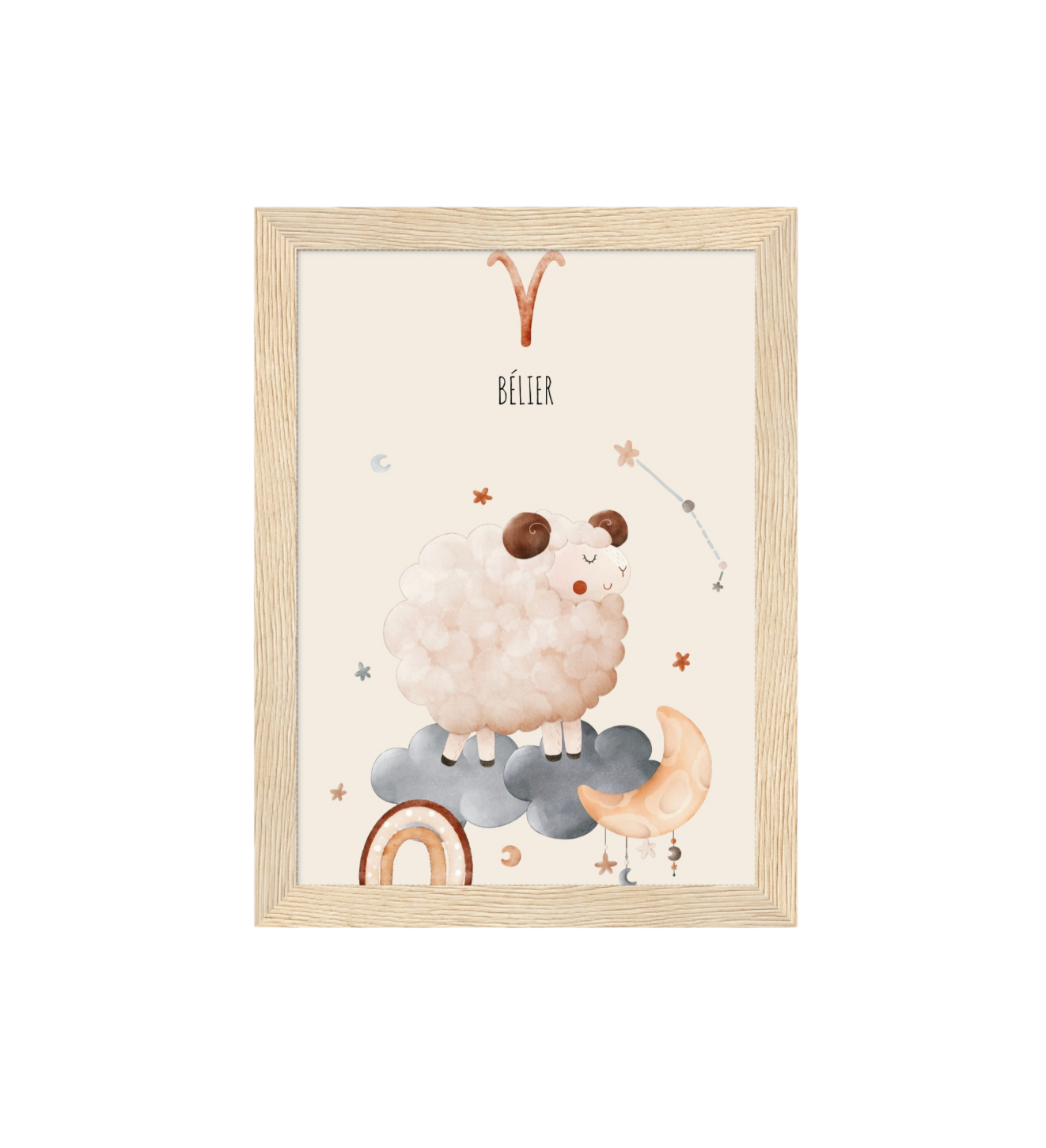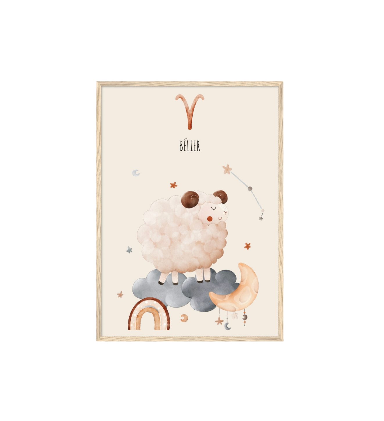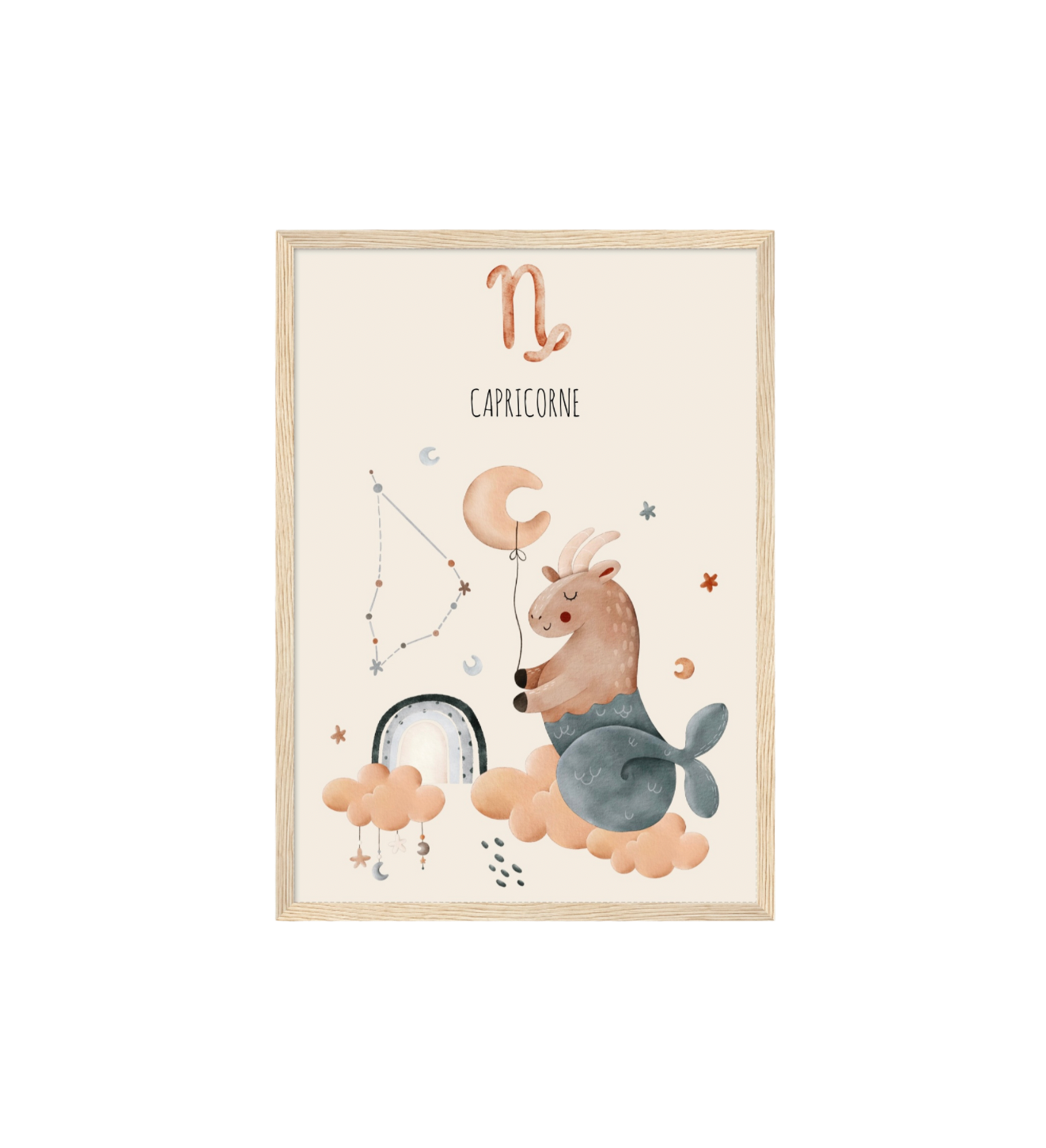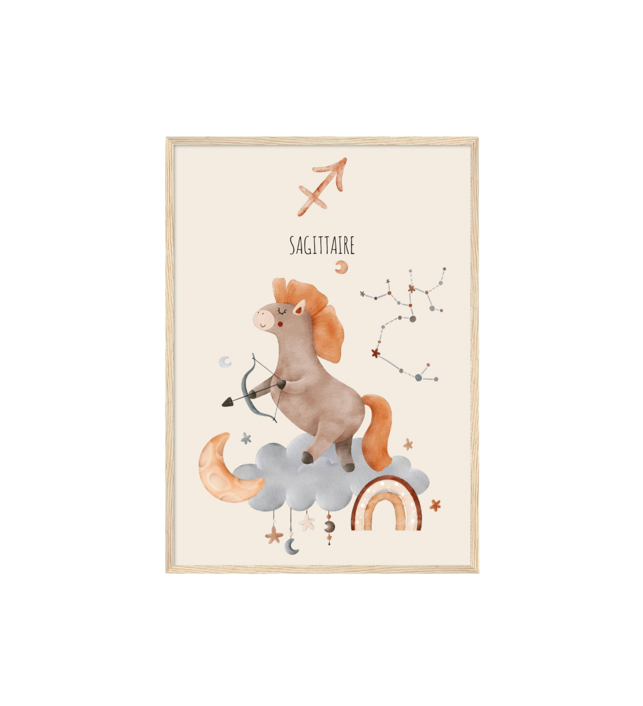 Ce cadre en bois met en valeur une illustration en aquarelle inspirée de son signe astrologique, pour un décor doux, poétique et intemporel.