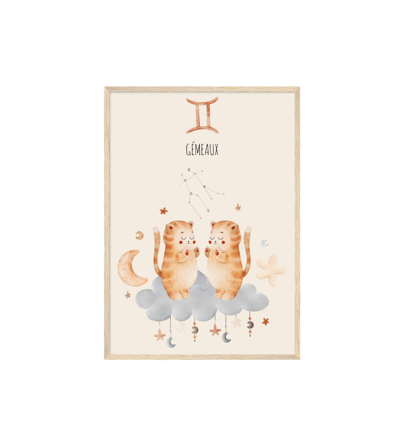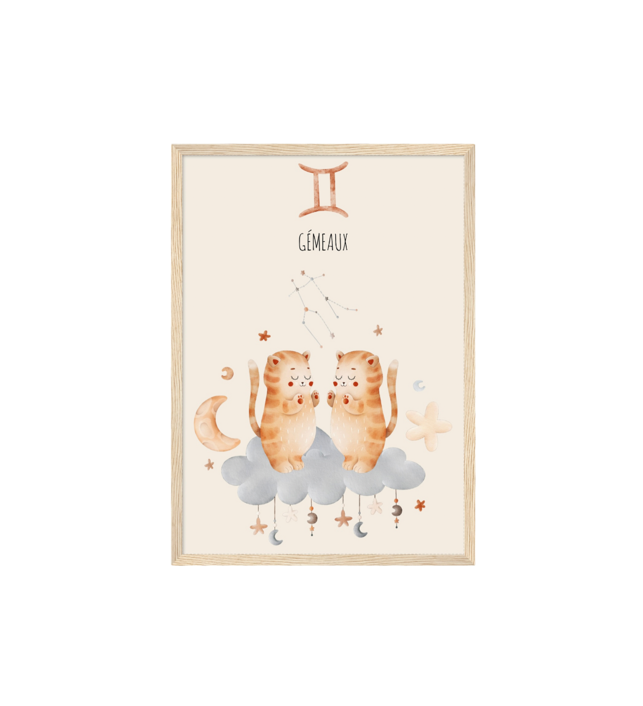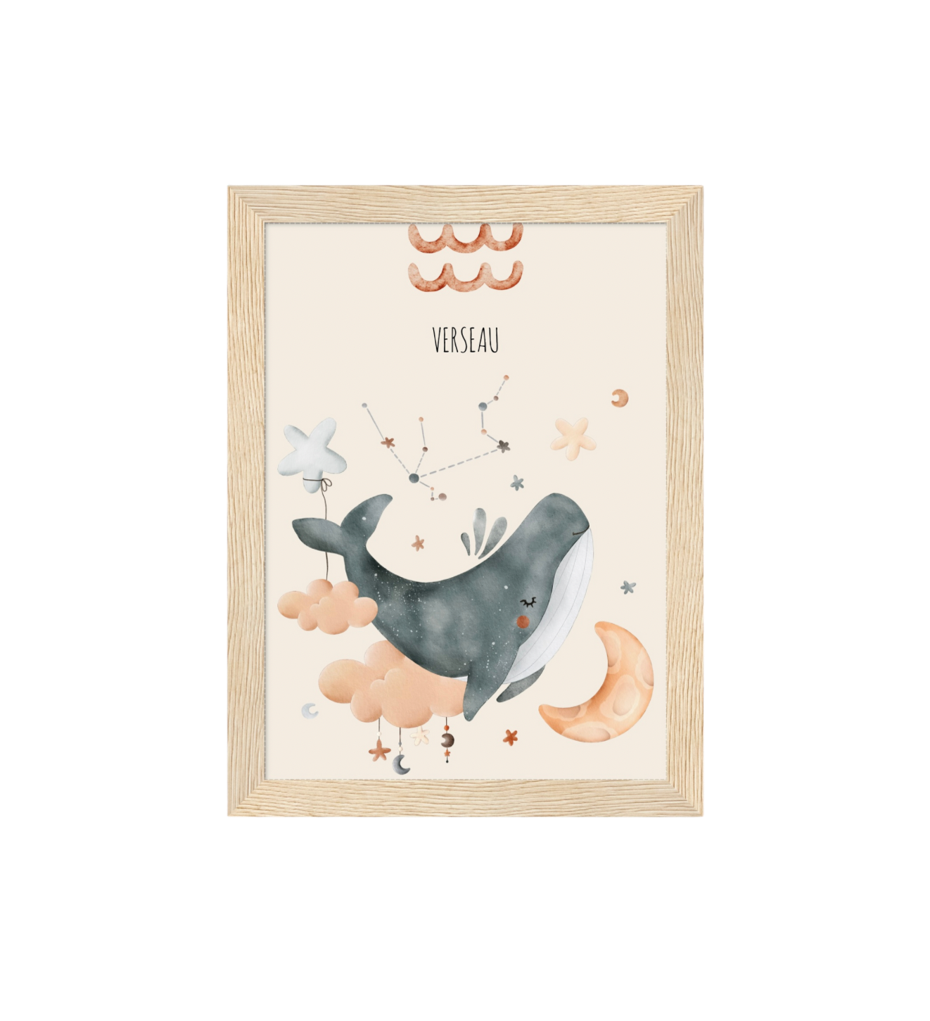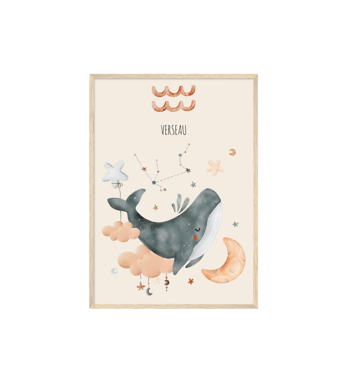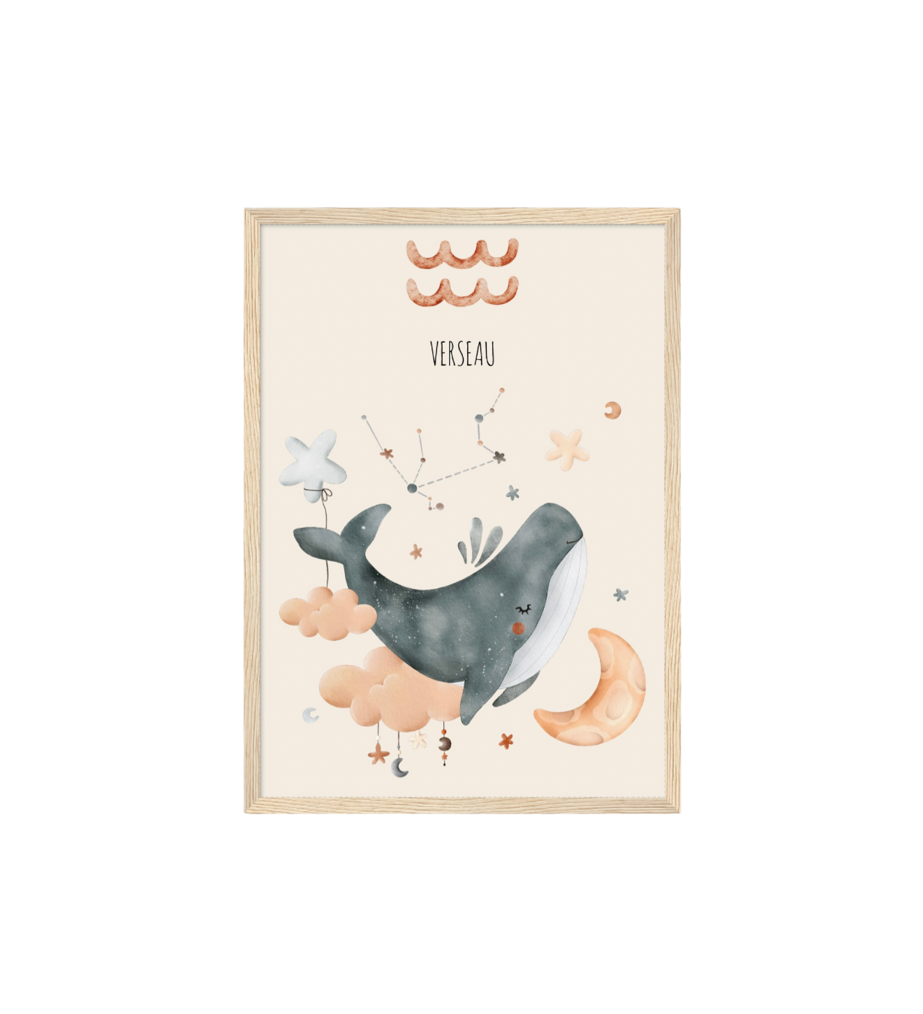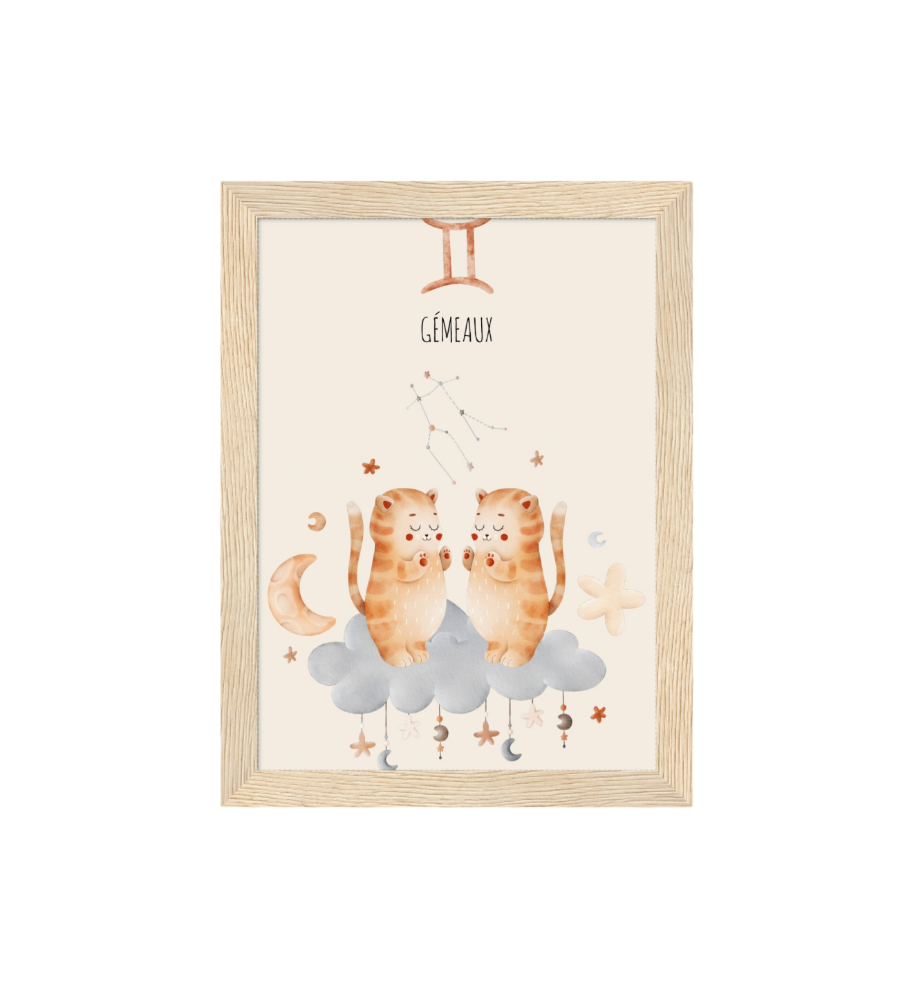 Ce cadre en bois met en valeur une illustration en aquarelle inspirée de son signe astrologique, pour un décor doux, poétique et intemporel.